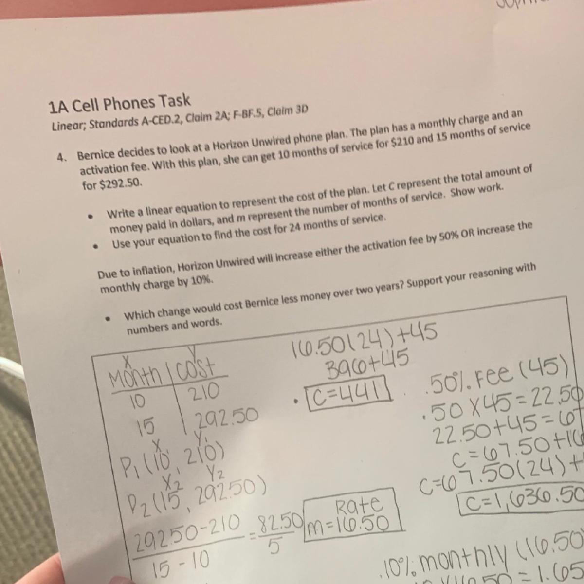 Increasing the slope (monthly charge) by 10% would mean 16.5*10% which is equal to 1.65. Add this to the original slope (because it is increasing), and you will see that the new slope would be 18.15.