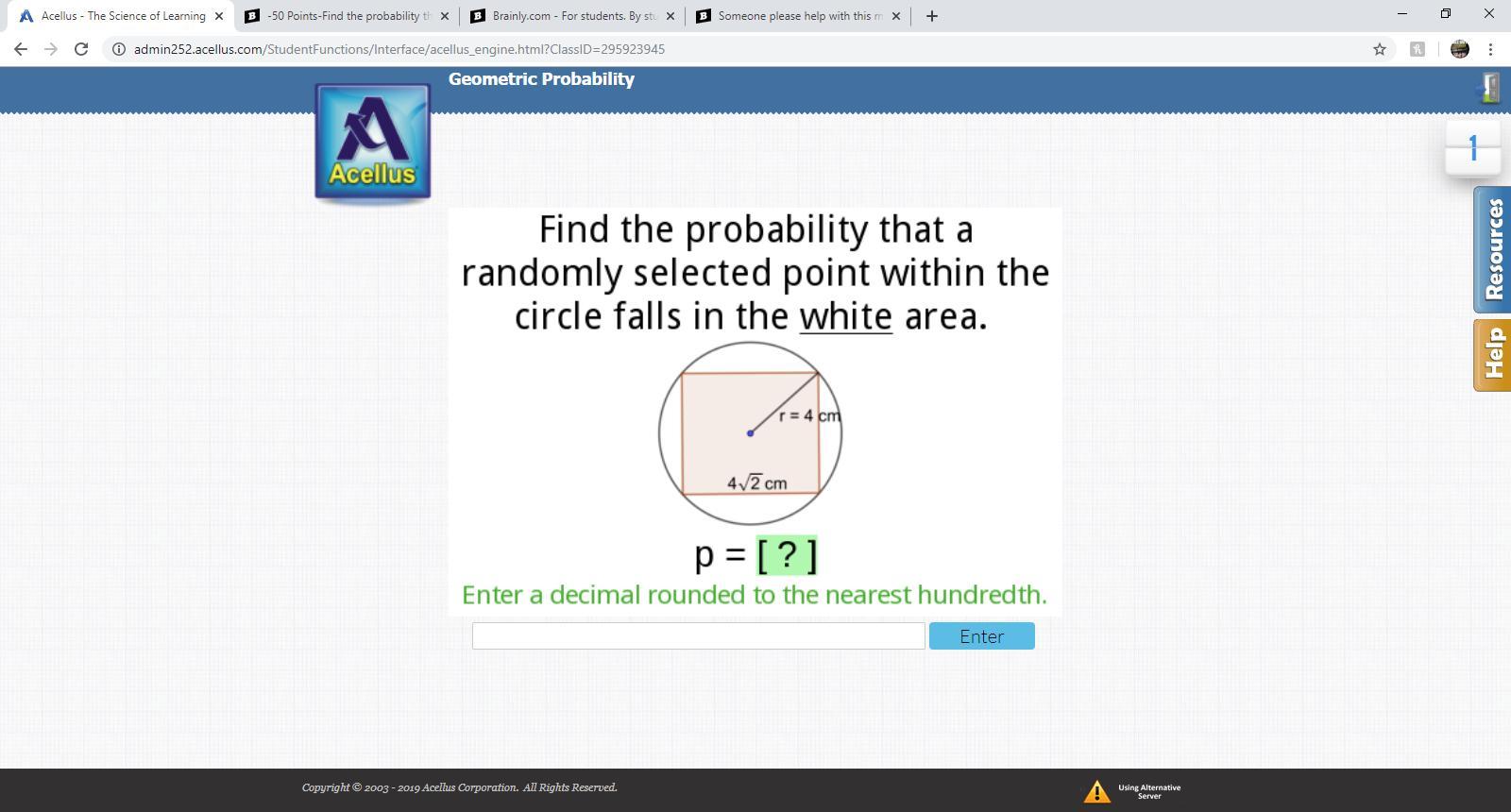 The probability of hitting a white area in the circle is about 0.36.