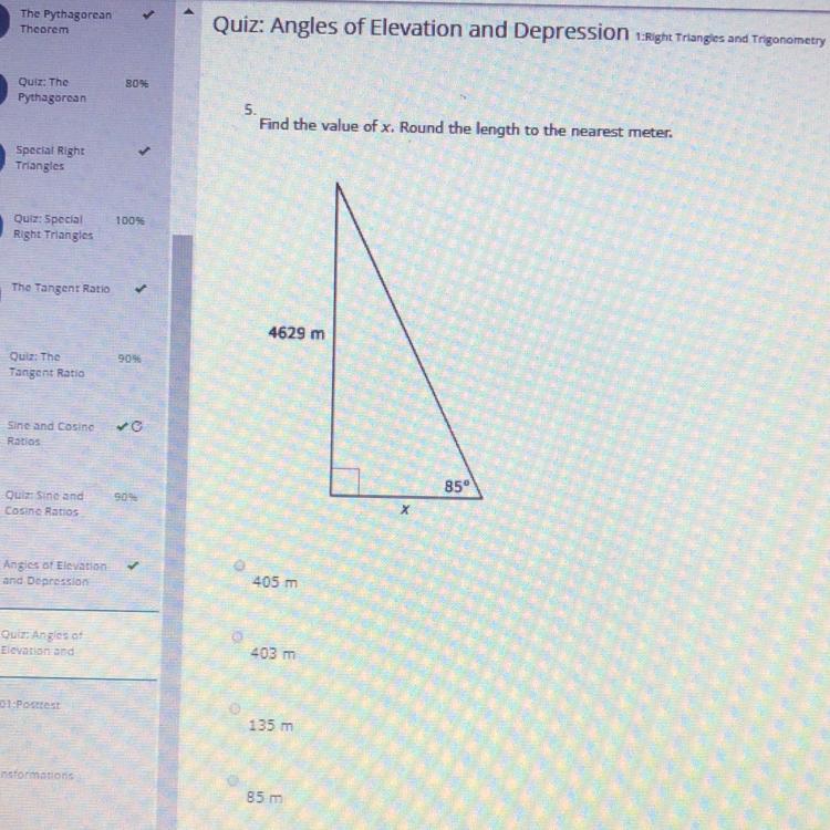 We know the opposite side of of the right triangle to be 4629m and the given angle is 85°.