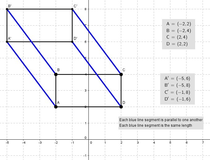 To prove they are parallel, you would use the slope formula to prove they have the same slope value. To show they are the same length, use the distance formula to show that the distance from A to A' is the same as the distance from B to B', etc etc.