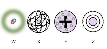 W represents the <u>current and accepeted atomic model</u>: a nucleus with an electron cloud, where the orbit and position of the electrons around the nucleus is defined by specific regions (associated with specific energy levels) where there is a greater probability of finding the electron at any given moment. It is important to note this model was improved by the works in quantum physics done by Louis de Broglie and Erwin Schrodinger.