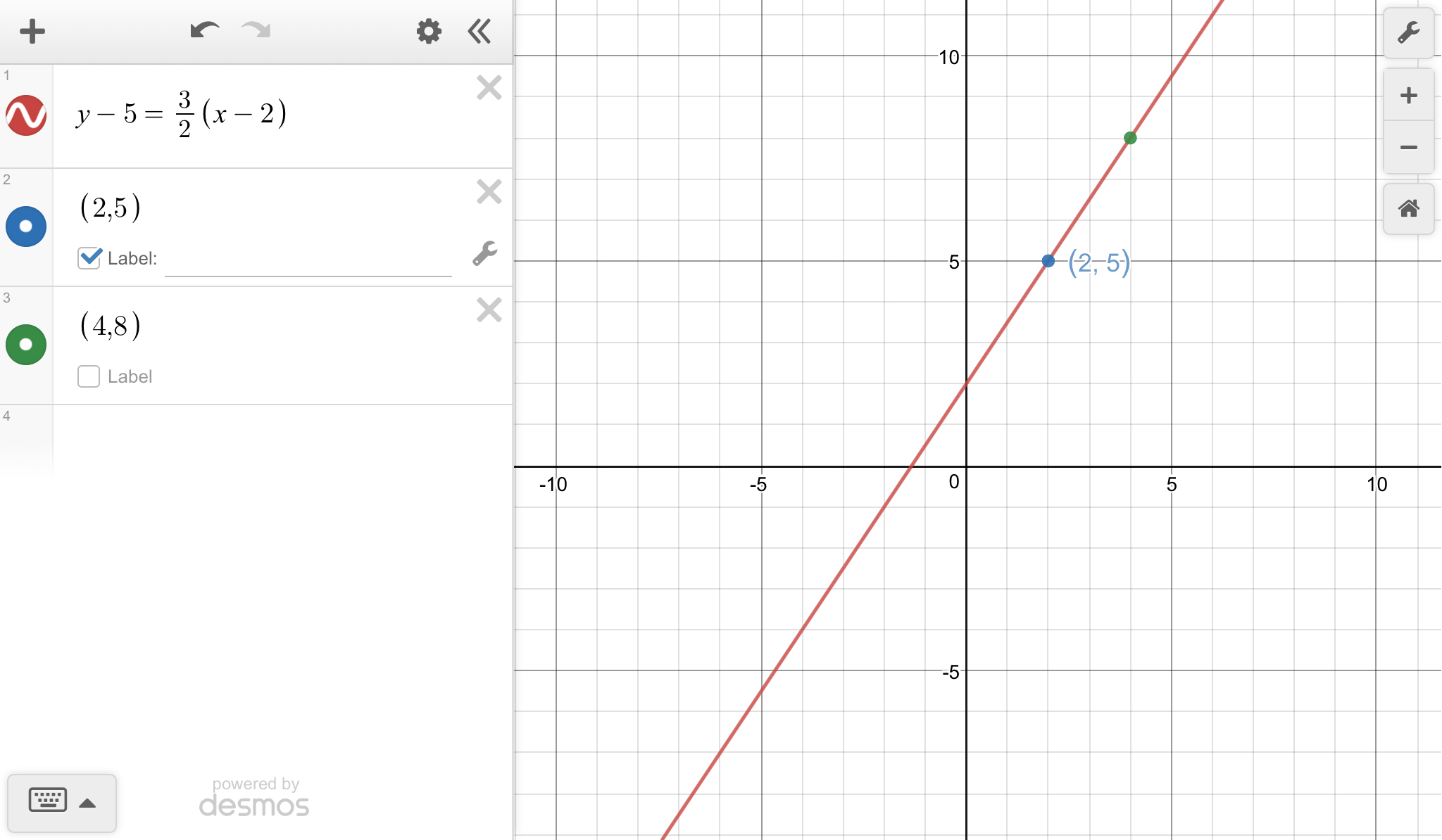 The slope of 3/2 tells you that going 2 units to the right (to x=4) will move the point up 3 units (to y=8).