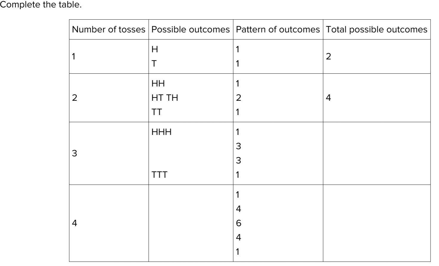 We can observe that the pattern of outcomes is exactly like the numbers appearing in the rows of the Pascal's triangle (with the exception of the first row of the triangle)!