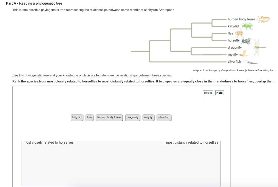 Evolutionary relationships between organisms are shown by phylogenetic trees. The organisms that are most closely related have more common ancestor than the most distantly related species. Hence, in the picture of phylogenetic tree below, fleas are more closely related to horseflies, even though some other species look like horseflies than fleas do.
