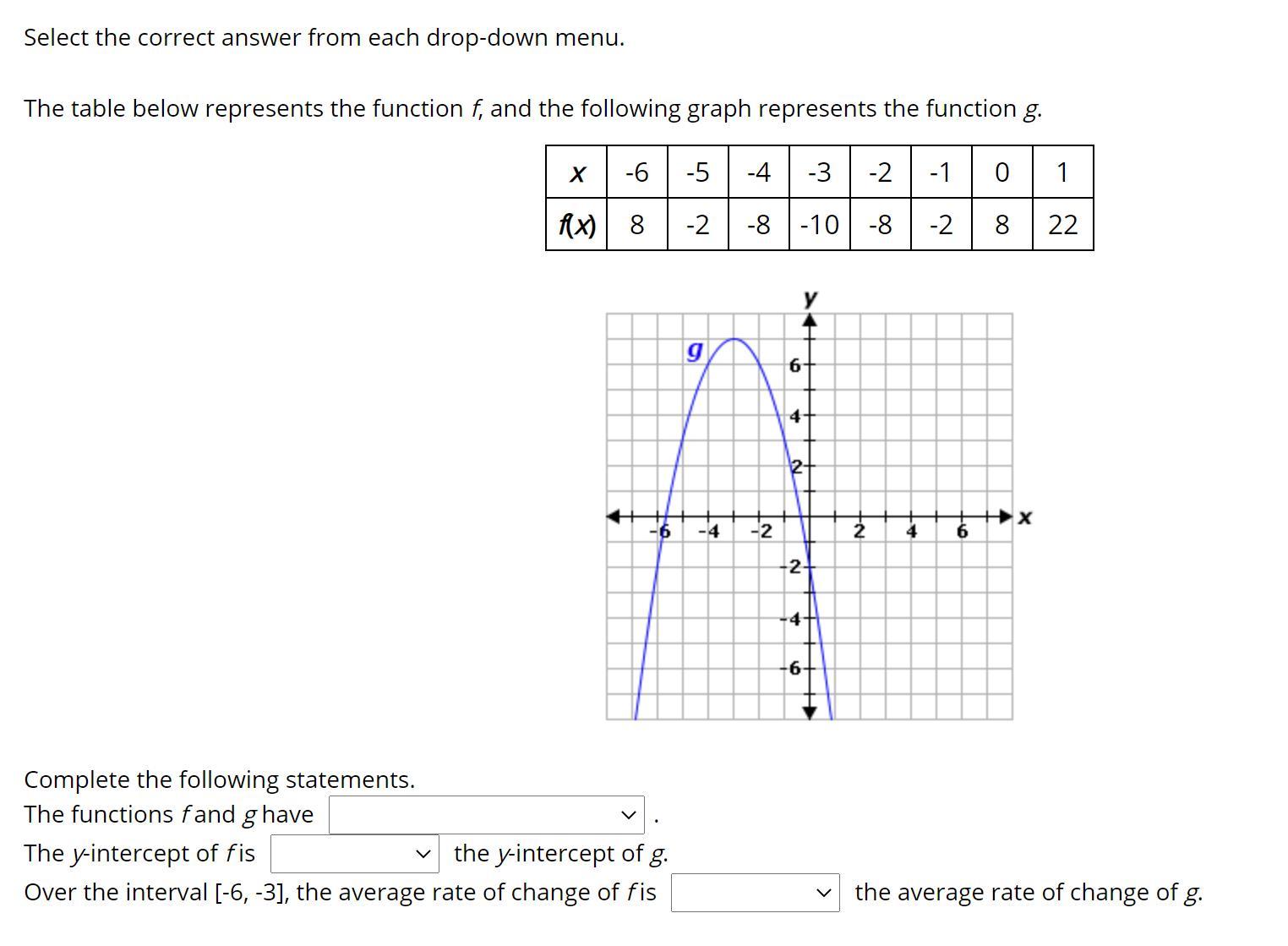 s the function g. x -6 -5 -4 -3 -2 -1 0 1 f(x) 8 -2 -8 -10 -8 -2 8 22 Complete the following statements. The functions f and g have .( same axis of symmetry ,different axis of symmetry) The y-intercept of f is (greater,equal,less) than the y-intercept of g. Over the interval [-6, -3], the average rate of change of f is (greater,equal,less than) the average rate of change of g.