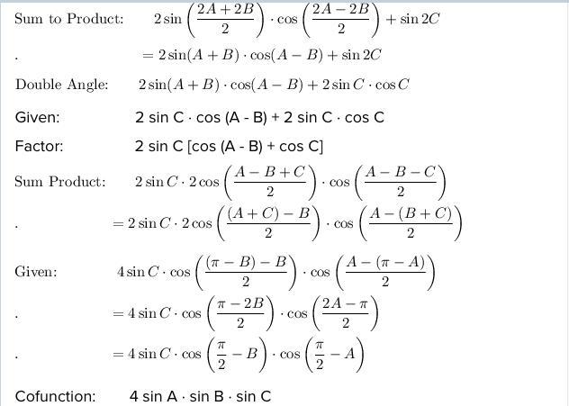 Given: sin[(π - A) - A) + sin [(π - B) - B] + sin [(π - C) - C]