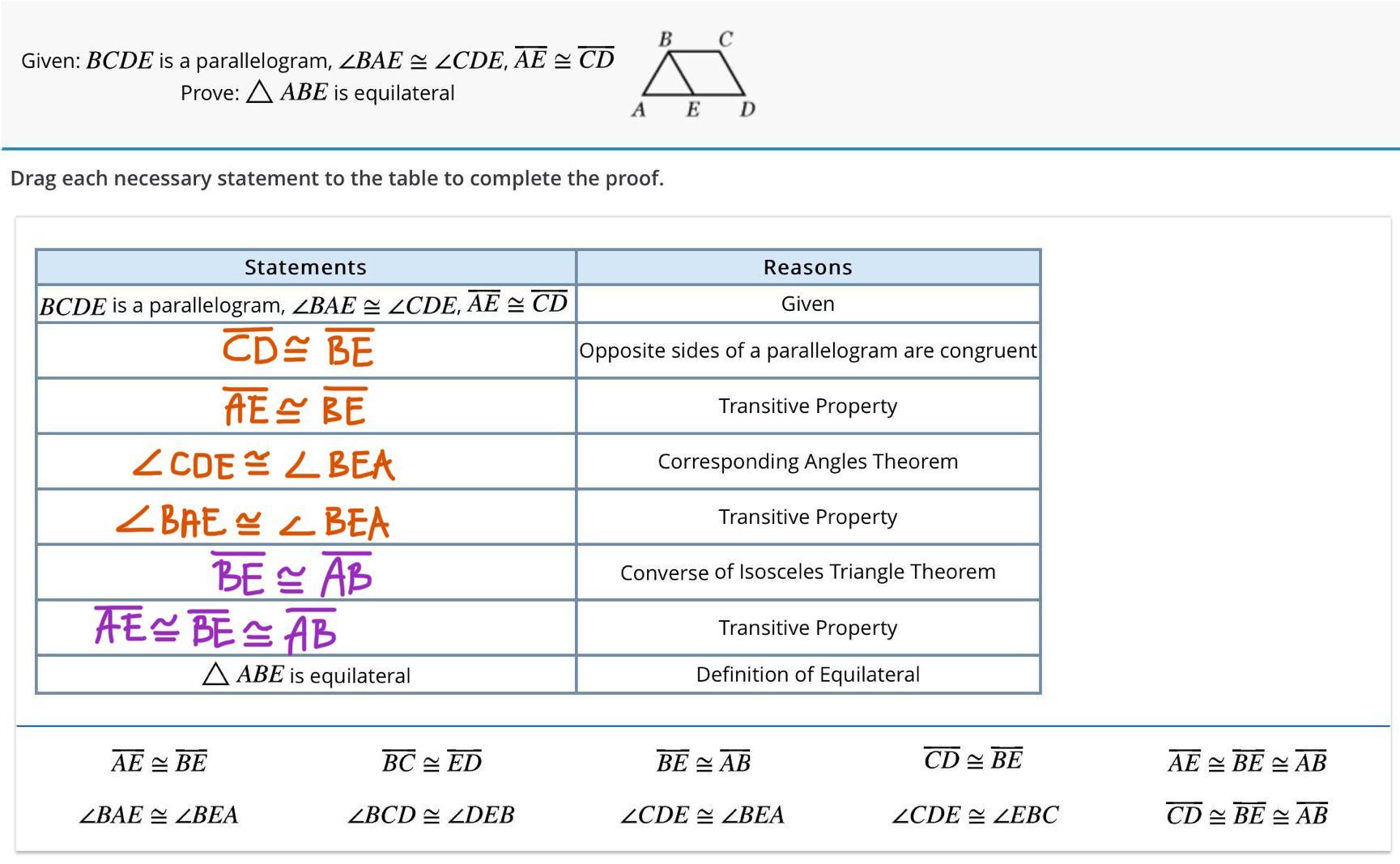 The two angles ∠BAE and ∠BEA are congruent in ΔABE ,then (according to the converse of isosceles triangles theorem) the sides opposite to these angles are congruent.