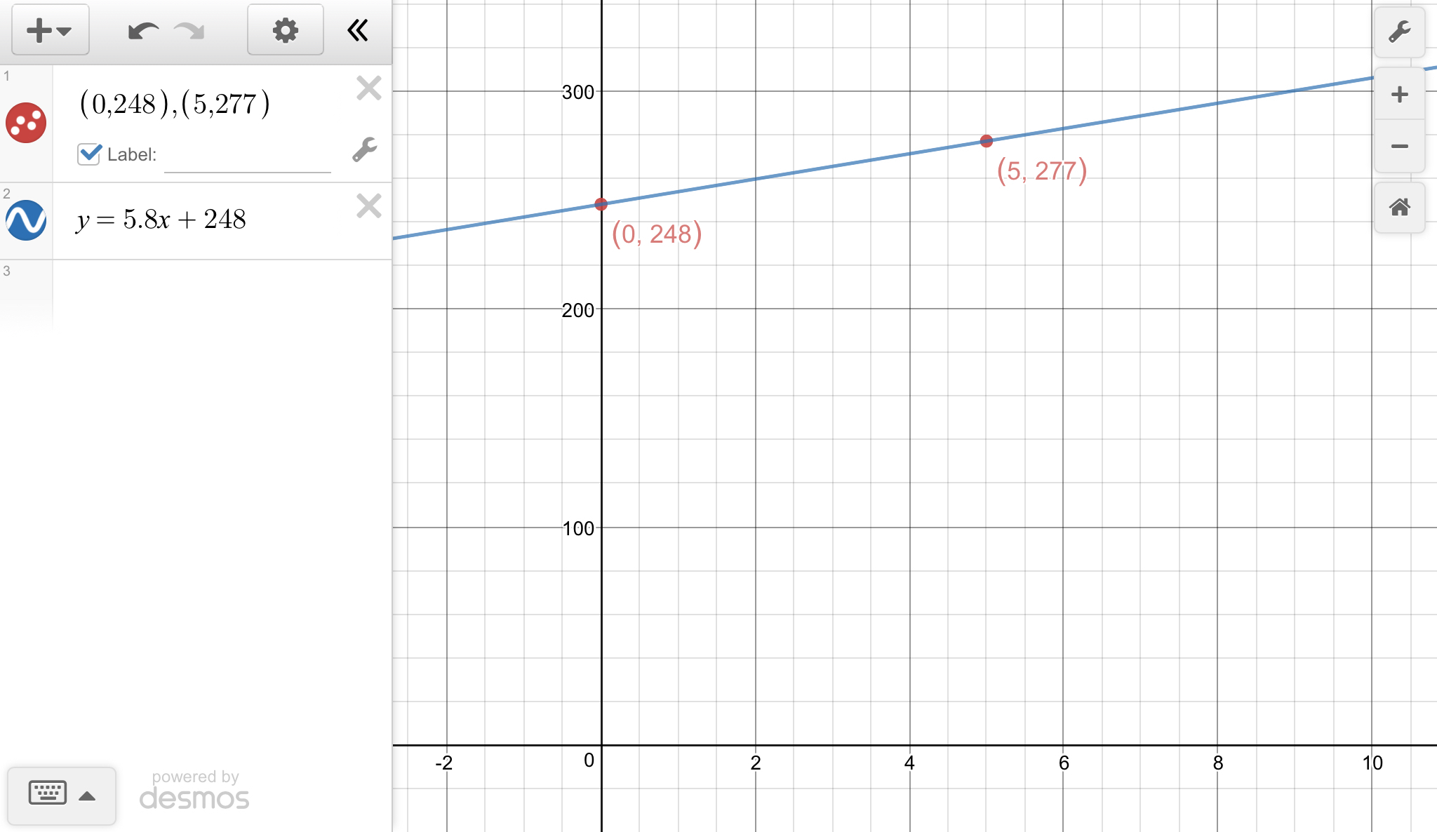 You want the equation for a line that goes through the data points (0, 248) and (5, 277). The slope is ∆y/∆x = (277-248)/(5-0) = 29/5 = 5.8. The first data point is the y-intercept, so your equation in slope-intercept form is