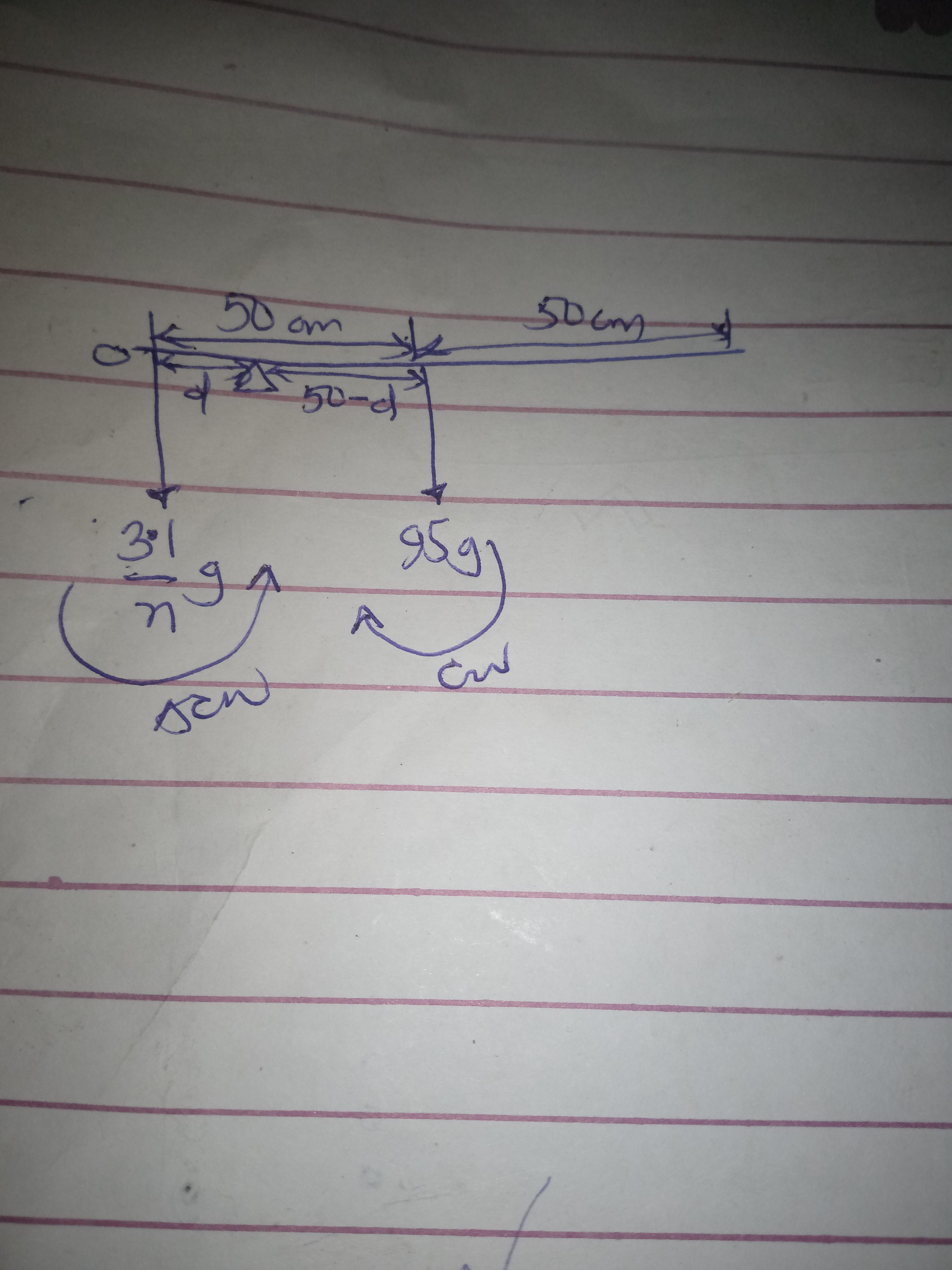 Since its a meter rule (100cm) the distance from the center mass(95g) to the pivot will be 50-d (check attachment for diagram).