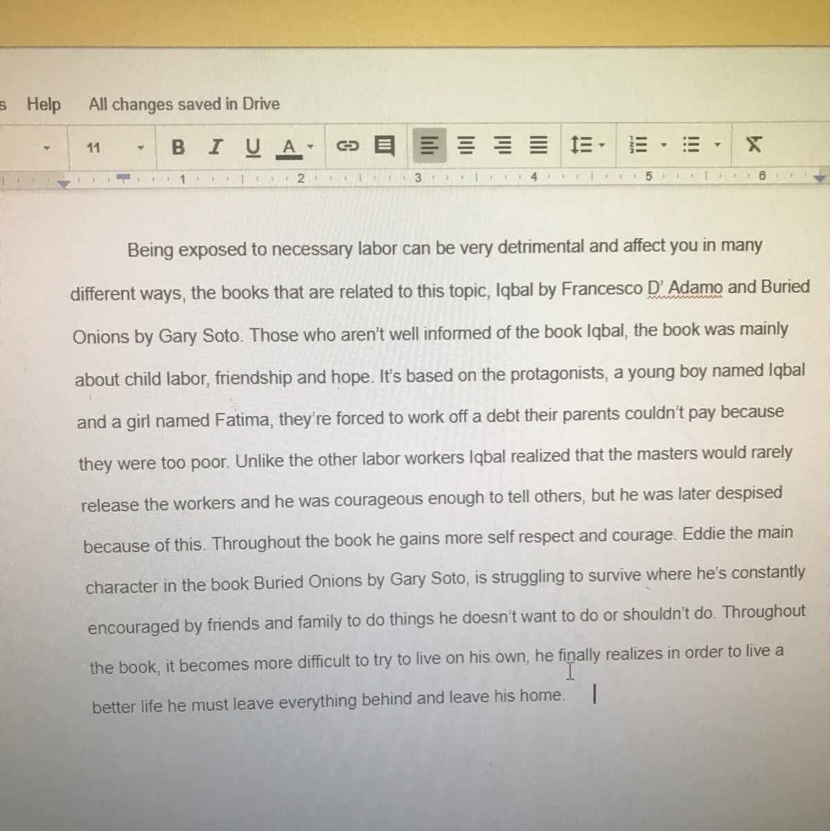 The first sentence is a bit of a run-on and can be changed into two sentences: "Being exposed to necessary labor can be very detrimental and affect you in many different ways. Some books that are related to this topic are "Iqbal" by Francesco D'Amamo and "Buried Onions" by Gary Soto." (For example)