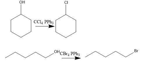 There are many ways to produce alkyl halides from primary and secondary alcohols. The reaction in this case is the Appel reaction.