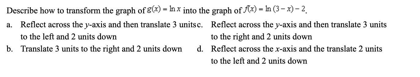 Dissecting the transformed function of f(x) = ln (3-x) -2 w.r.t f(x) = ln x, we see: