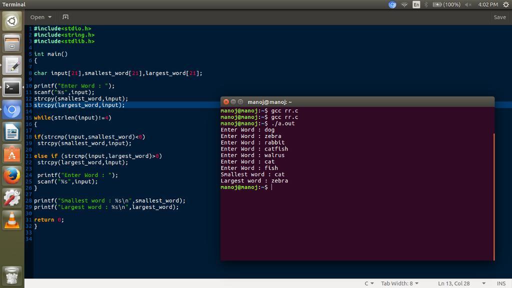 gram will determine which words would come first and last if the words were listed in dictionary order. The program must stop accepting input when the user enters a four-letter word. Assume that no word is more than 20 letters long. An interactive session with the program might look like this: Enter word: dog Enter word: zebra Enter word: rabbit Enter word: catfish Enter word: walrus Enter word: cat Enter word: fish Smallest word: cat Largest word: zebra Hint: Use two strings named smallest_word and largest_word to keep track of the "smallest" and "largest" words entered so far. Each time the user enters a new word, use strcmp to compare it with smallest_word; if the new word is "smaller", use strcpy to save it in smallest_word. Do a similar comparison with largest_word. Use strlen to determine when the user has entered a four- letter word.