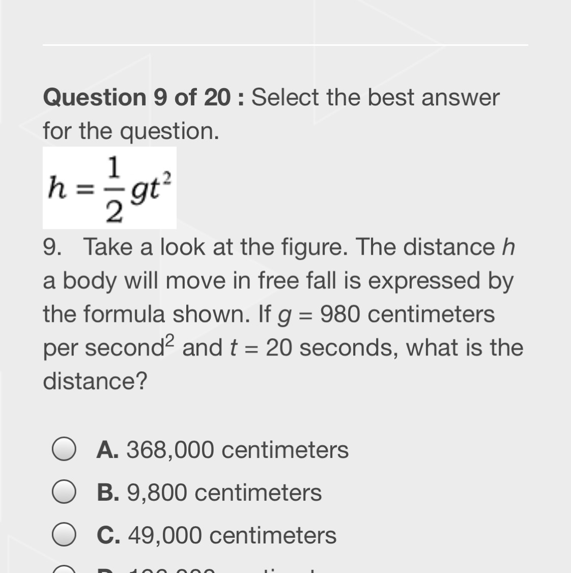 Take a look at the figure. The distance h a body will move in free fall is expressed by the formula shown. If g = 980 centimeter s per second2 and t = 20 seconds, what is the distance? A. 368,000 centimeters B. 9,800 centimeters C. 49,000 centimeters D. 196,000 centimeters