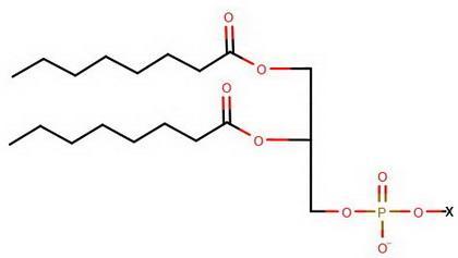 The structure below shows the phospholipid with two saturated C₈ fatty acids and the phosphate group.