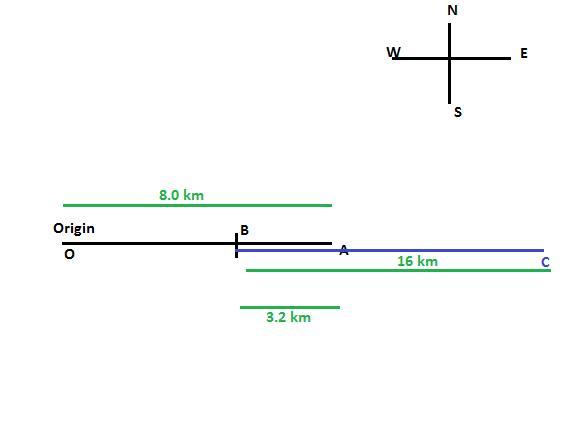 As we can see that the total displacement is OC = OA- AB + BC = 8.0-3.2+16 = 20.8 km