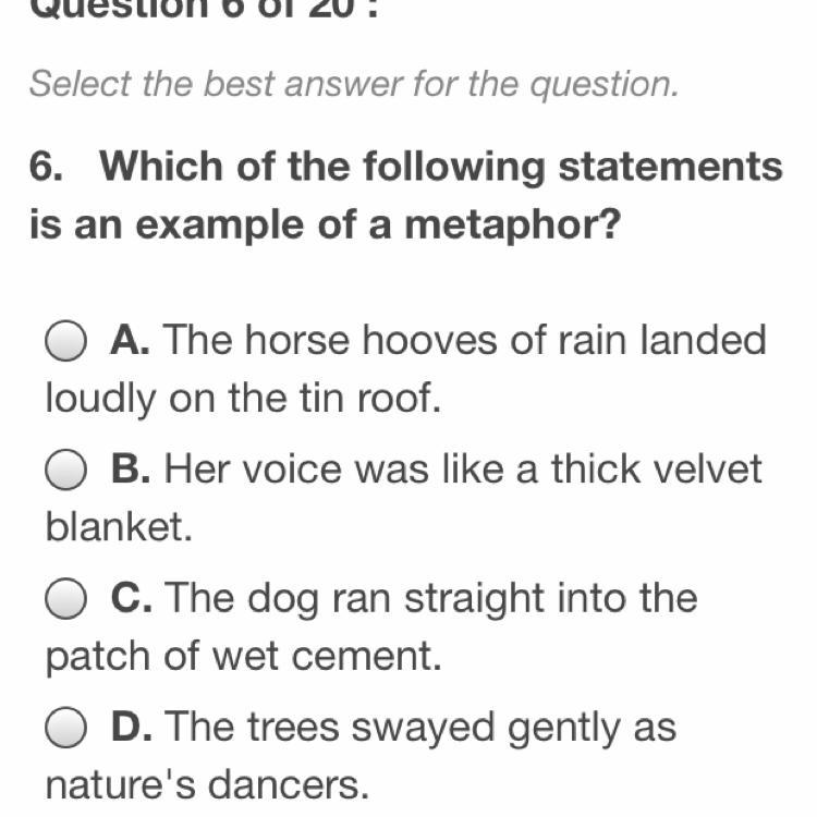 A metaphor is a form of comparison without using the words such as "like" or "as," because that would be a simile. This means that C and D are incorrect, because those are examples of a simile, not a metaphor. In B, nothing is being compared, so that option is also incorrect. Thus, the correct answer is A, where "hooves of rain" is a metaphor - horses don't really have hooves made of rain, but somehow resembling rain.