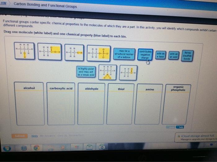 tify which compounds exhibit certain chemical properties as well as examples of those six different compounds. Drag one molecule and one chemical property to each bin. If one property can apply to more than one functional group, choose the best answer for each functional group.