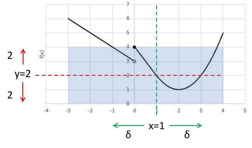 What this means is, how far can x stray from the x=1 line such that f(x) stays within 2 units of the y=2 line (0 < f(x) < 4).