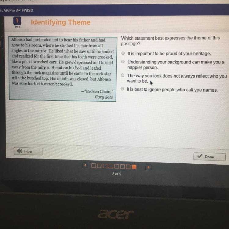 We can see this during the entire reading. When Rachel says "I'm eleven today. I'm eleven, ten, nine, eight, seven, six, five, four, three, two, and one, but I wish I was one hundred and two. I wish I was anything but eleven. Because I want today to be far away already, far away like a runaway balloon, like a tiny o in the sky, so tiny —tiny you have to close your eyes to see it. " (Cisneros, 1991), we can see how the character is napping in a dilemma with herself, where she did not want to be what she is and even though she is in a moment that should be celebrated, she dreams of being something else, very distant than what it really does.