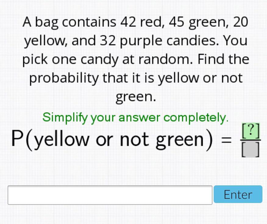 A bag contains 42 red, 45 green, 20 yellow, and 32 purple candies. You pick one candy at random. Find the probability that it is