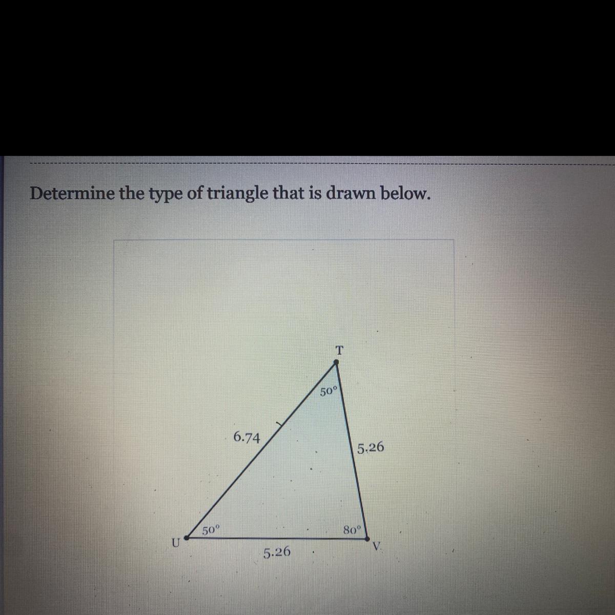 Looking at the image provided, you can see that there are two congruent angles (50 degrees) and the two congruent sides (5.26), making the triangles isosceles.