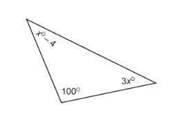We know that the interior angles of a triangle add up to 180 degrees. We already have one angle, the bottom one, so let's just get that out of the picture by subtracting it from 180. The other two angles add up to be 80 degrees. What we can do is combine them together and get 4x-4=80. We have 4x because of x+3x. It equals 80 because that's what the two angles together add up to be. What we want to do now is get x by itself. Subtract 4 from both sides and get 4x=76. Now, we divide by 4, to undo multiplication. We are left with x=19, and now we have our answer.