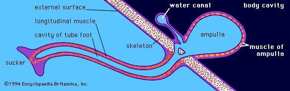 Water vascular system provides the vascular pressure which allows the tube feet to operate. Water enters the system through a sieve-like structure on the upper surface of the animal, called the madreporite. From here it moves into the ring canals and into radial canals and then into the tube feet, which allows them to move.Water also leaves through madreporite.