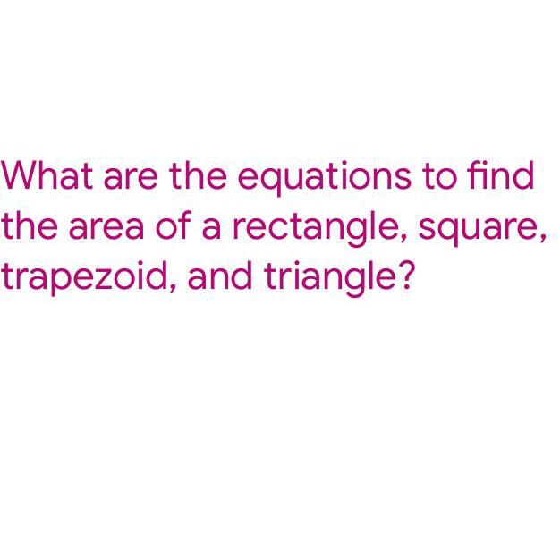 The equations to find the area of a trapezoid are: multiply the sum of the upper base and lower base by the height and then divide by 2. A =