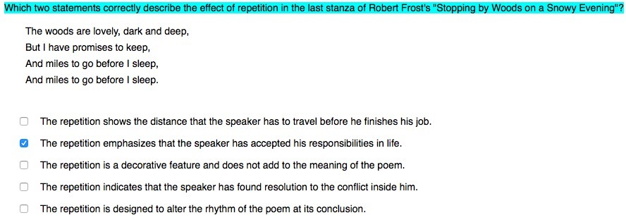 It's not E. These are essay questions, because all except E are justifiable. The rhythm is the same as the first two line. A is a good answer in my mind. It's not C either. Great Poetry never uses so much as 1 word it does not need. I suppose by my thinking, it should be D. There is conflict in him. Promises vs. The invitation of the dark deep lovely woods. D is your best alternate.