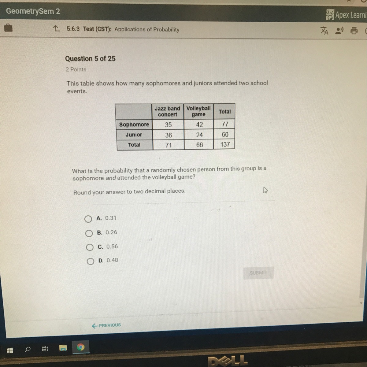 P(sophomore & volleyball) = 0.26