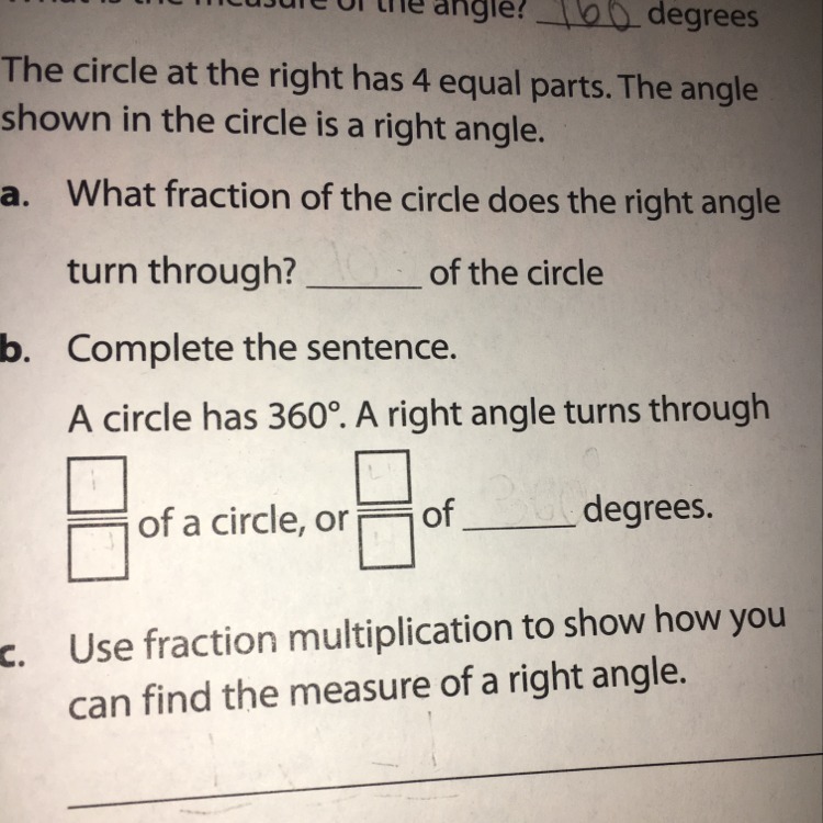 B.] A right angle runs through 90/360 of a circle, or 1/4 of 360 degrees.