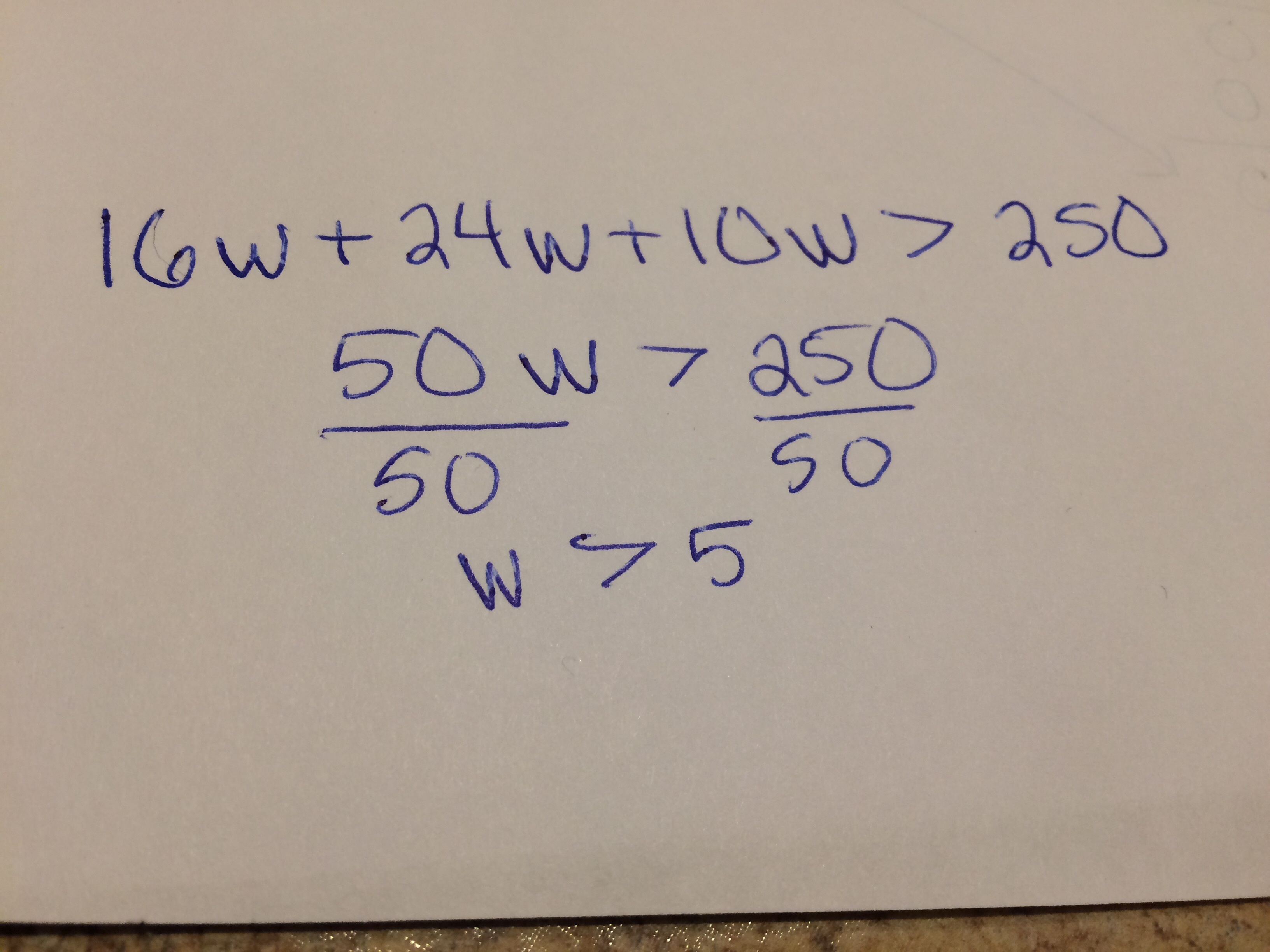 To answer this question you would need to solve this inequality. The first step would be to combine all three terms on the left-hand side of the greater than symbol. By doing this you would have 50w > 250. To solve this inequality divide both sides by 50. The answer is w > 5. In words, this means the number of walnuts per spoonful is greater than five.
