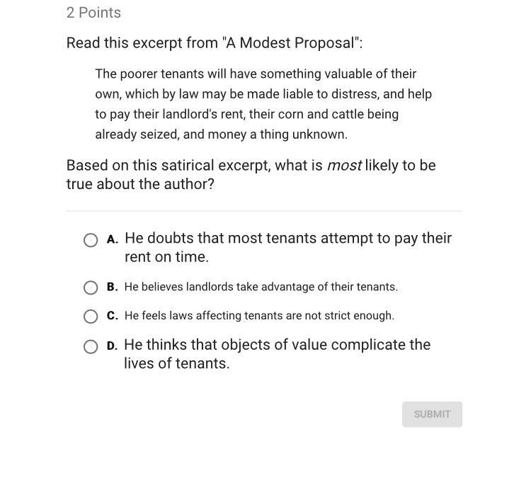 A Modest Proposal was written by English writer Jonathan Swift, and its complete tone is satirical; there the author proposes that poor Irish ease their problems by selling their kids. In this specific passage the speaker points out that he believes landlords take advantage of their tenants.