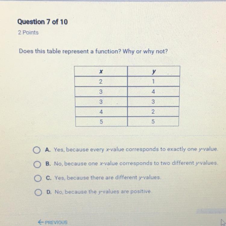 In the table, we can see that one x-value, 3, has two different outputs for y, 4 and 3. A function should only have one output for every input, thus this is not a function for the reason that one x-value corresponds to two different y-values. It is not D because it doesn't matter if y-values are positive or negative in a function.