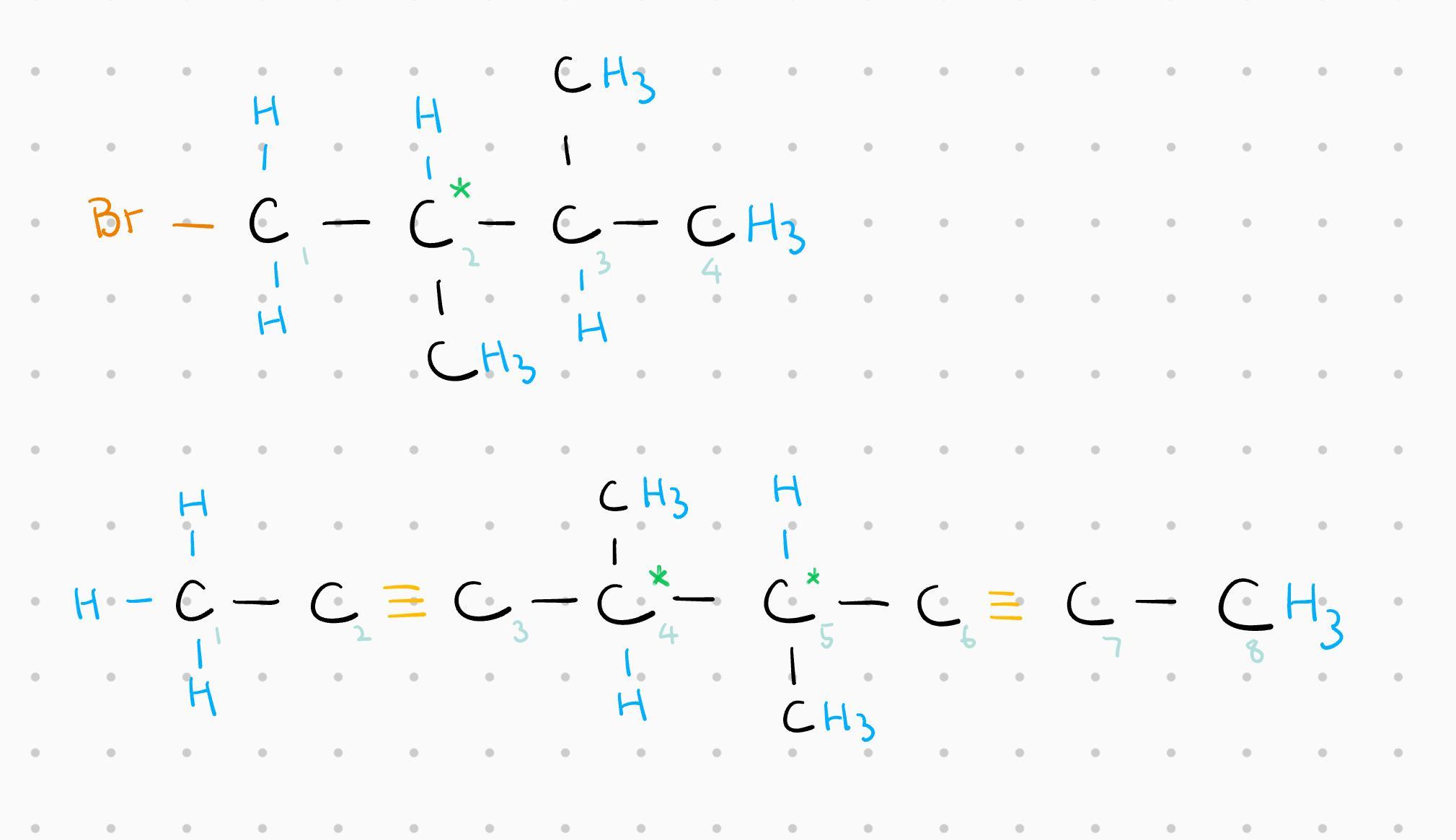 Start by sketching the structure of the two compounds. (A colored sketch of the two compounds is attached.) The first compound is a branched halogen-alkane with four carbon atoms in its backbone. The second is a branched alkyne with two triple bonds.