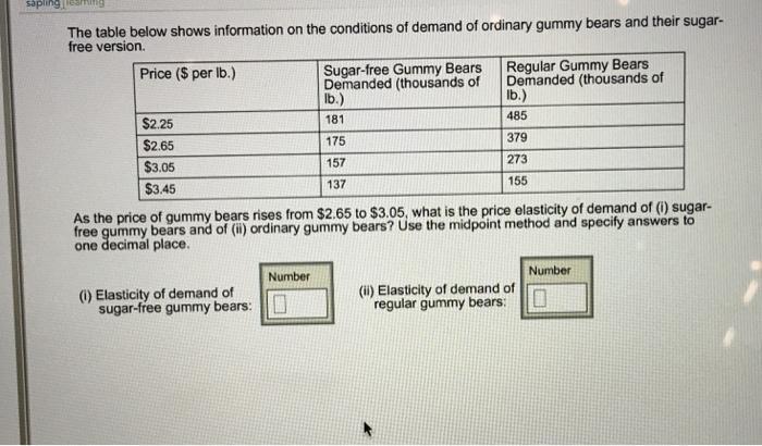 Answer: In order to answer this question, a table showing different prices and quantities demanded of sugar-free gummy bears and of ordinary gummy bears will be added in the explanation section.
