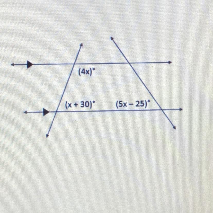 Two lines are parallel and one line having two adjacent angles (4x)° and (x + 30)° are the transverse.