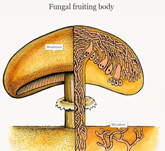 Mushroom is the most common example of fungus with a prominent fruiting body. Now the question is how the fruiting body is formed, they are produced from small thread like structures called hyphae that make most of the fungus body and are collectively termed as mycelium. They grow above the soil layer and develop new structures called gills,cap and stalk. In gills of the fruiting body, spored are formed.
