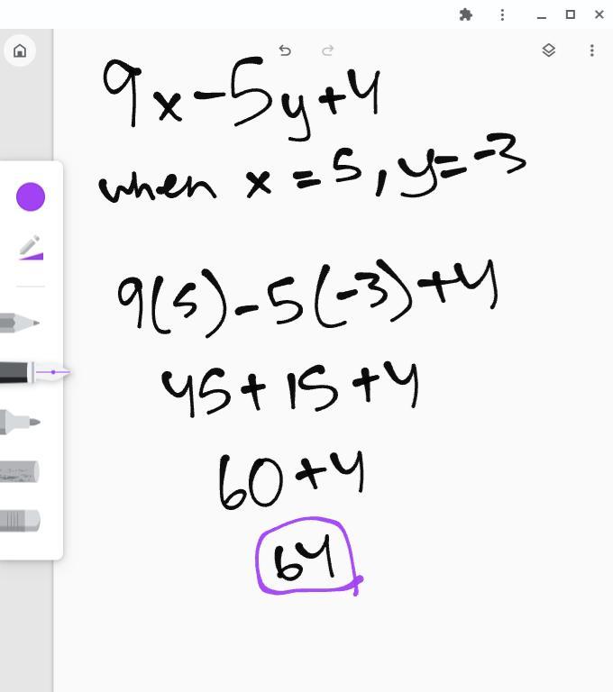 LEvaluate the expression for x=5, y=-3 and z=7 9x - 5y +4
