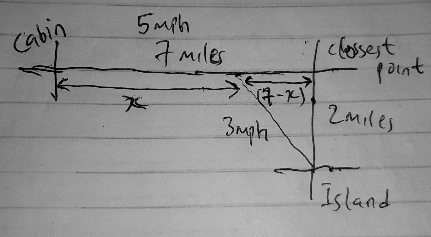 The distance from that endpoint of running to the closest point on the shoreline to the island is then (7 - x) miles