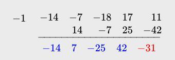 When odd term signs are negated, the signs become (- + - - +), so there are 3 sign changes. This means there is 1 or 3 negative real roots. f(-1) = -31, so there is a negative real root in the interval (-1, 0).