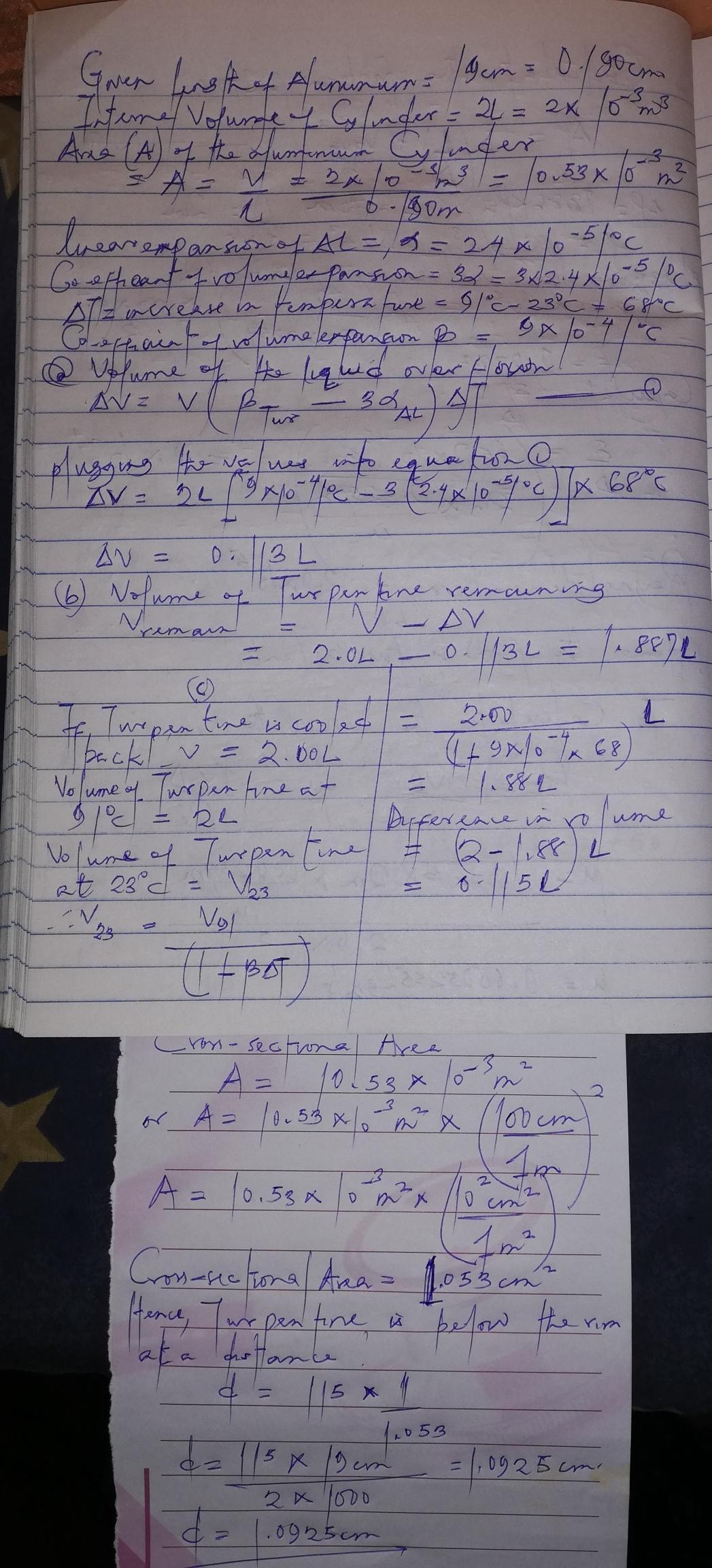 (c) If the combination with this amount of turpentine is then cooled back to 23.0°C, how far below the cylinder's rim does the turpentine's surface recede in cm?