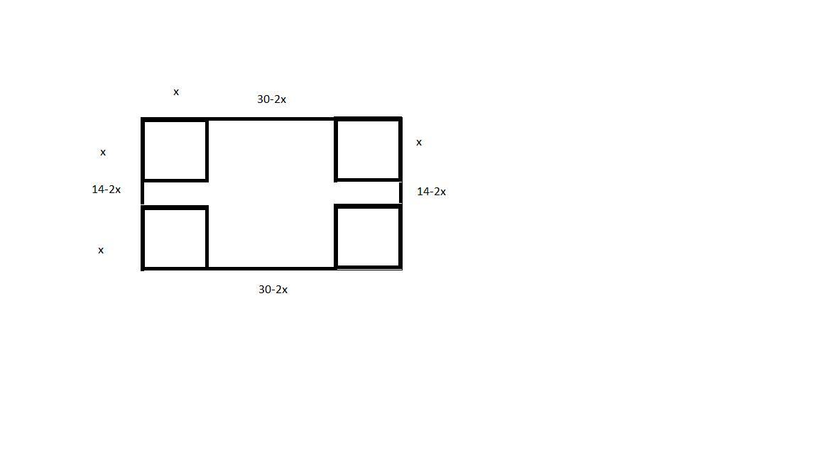 = (30-2x)(14-2x)x