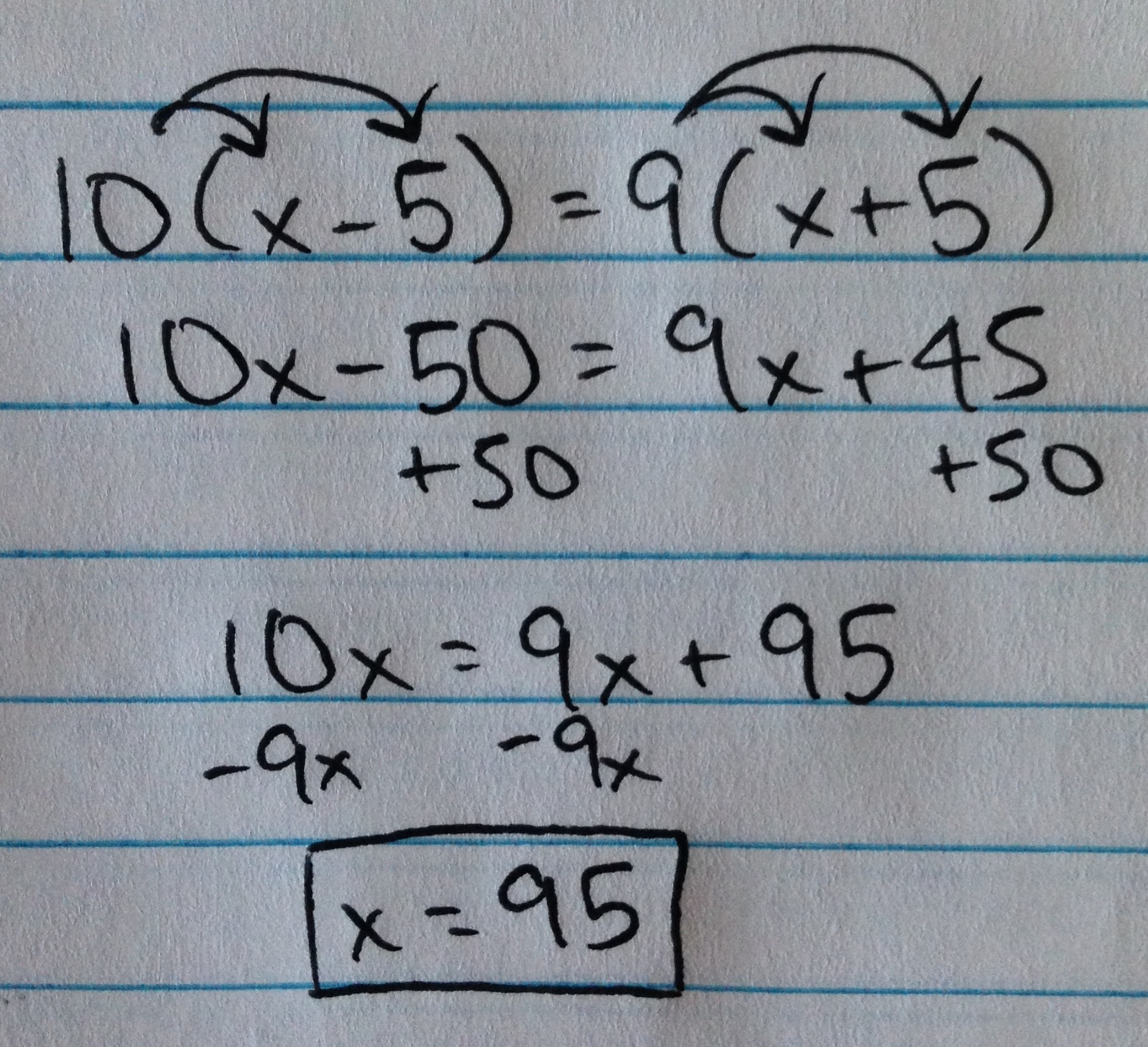 Check attached image for work; your answer is x = 95.