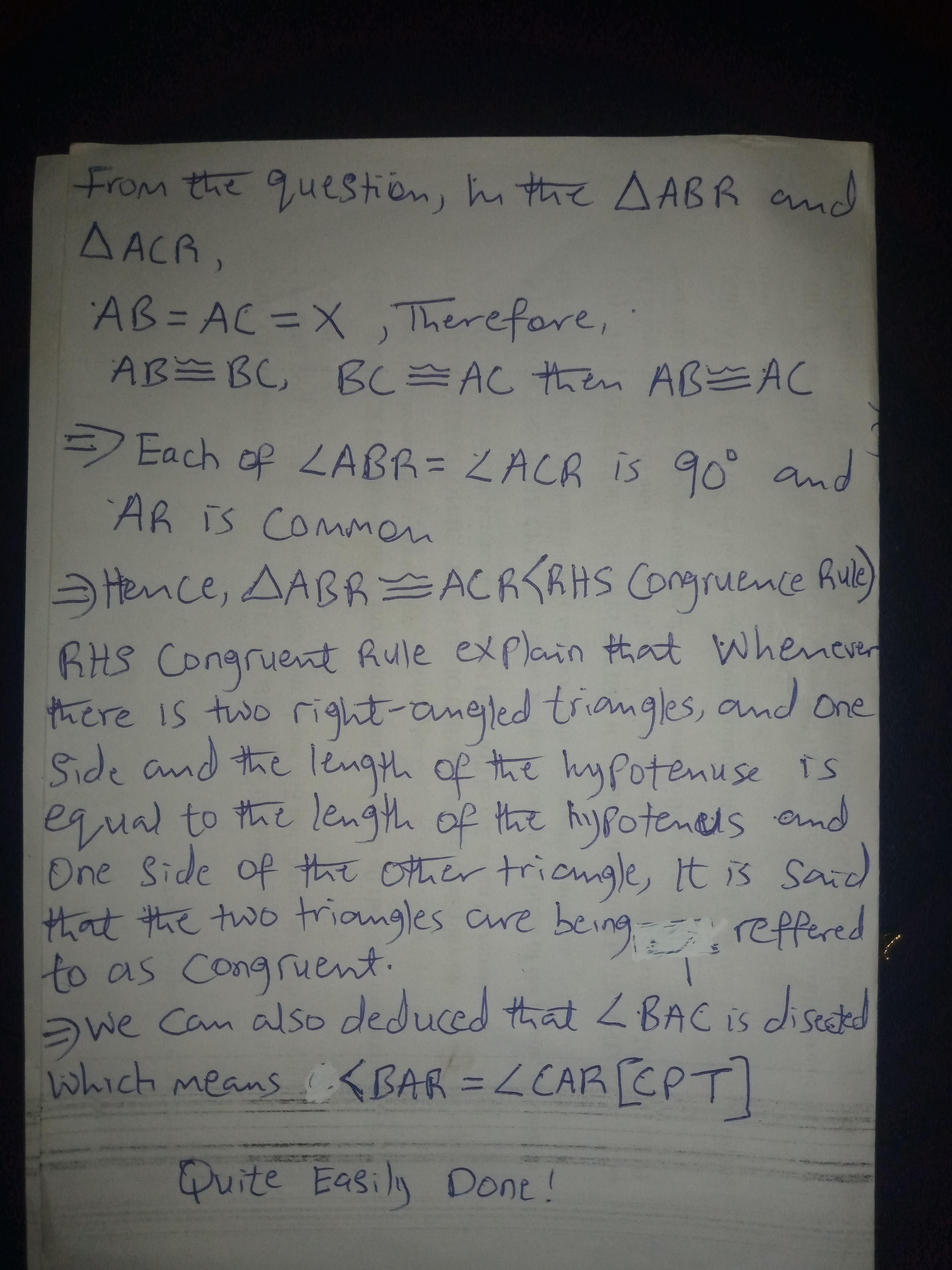 From the question, In the ΔABR and ΔACR , AB=AC=X