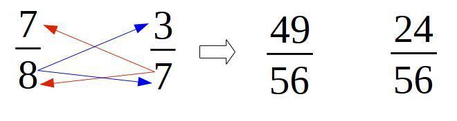 hmmm so, notice the arrows, if we simply multiply top and bottom of one fraction by the other's denominator, we end up with two fractions, with the same denominator