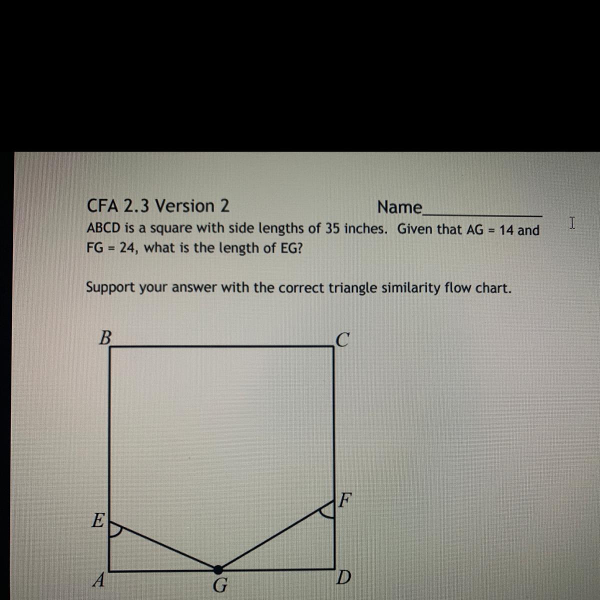 ABCD IS A SQUARE WITH LENGTHS OF 35 INCHES GIVEN THAT AG=14 AND FG=24 WHAT IS THE LENGTH OF EG