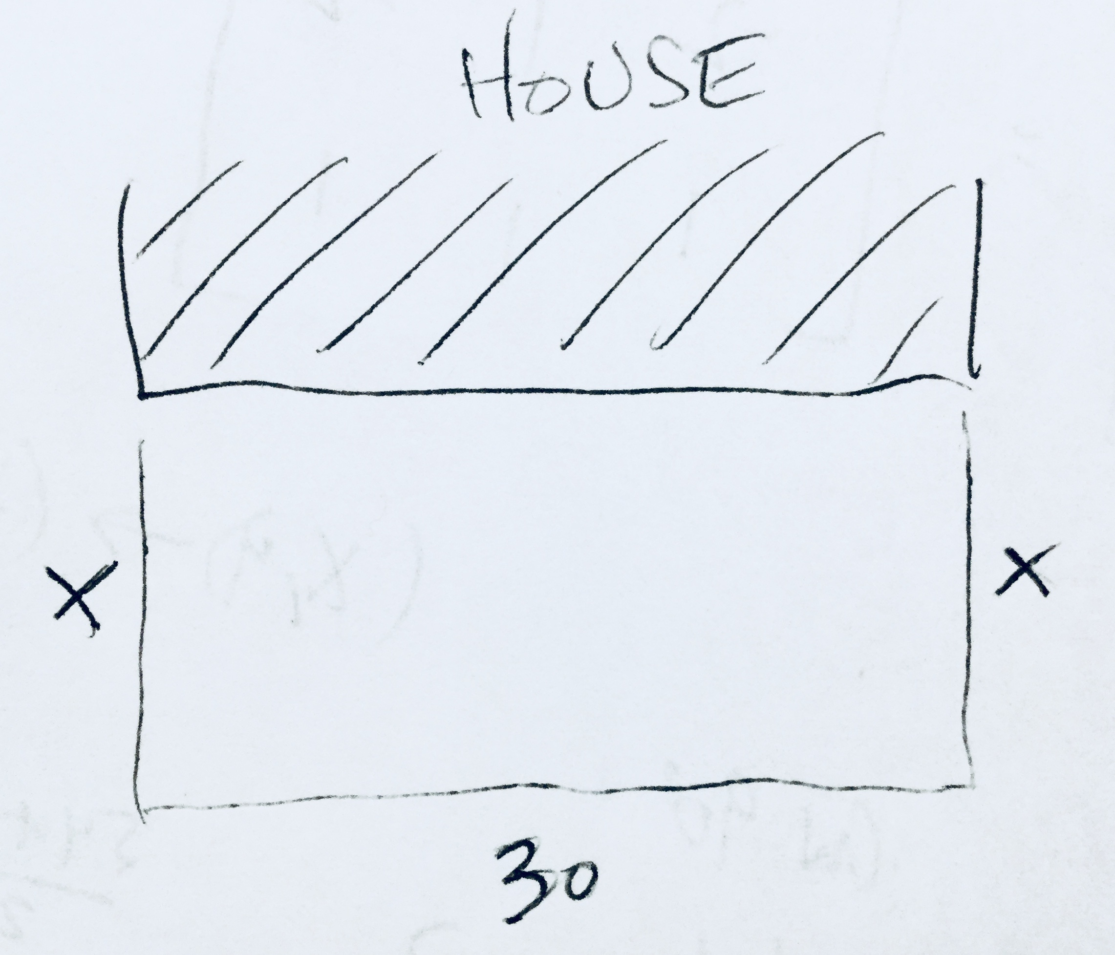 Sometimes a diagram can be helpful. If x is the distance from the house to the parallel side of the fenced plot, then the total length of fence will be x + x + 30 (feet). Jane wants to find x such that this length is 100 (feet).