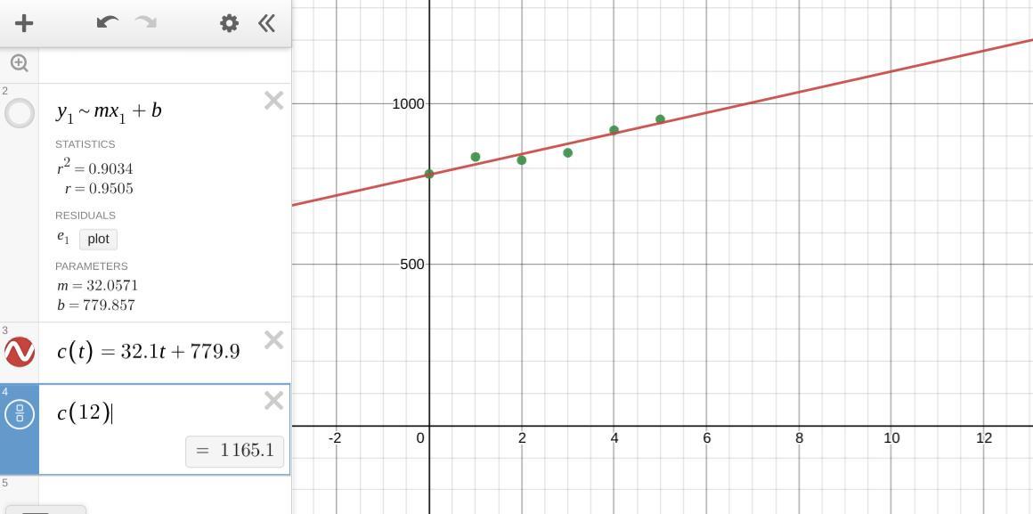 y = 32.1×12 +779.9 = 385.2 +779.9 = 1165.1